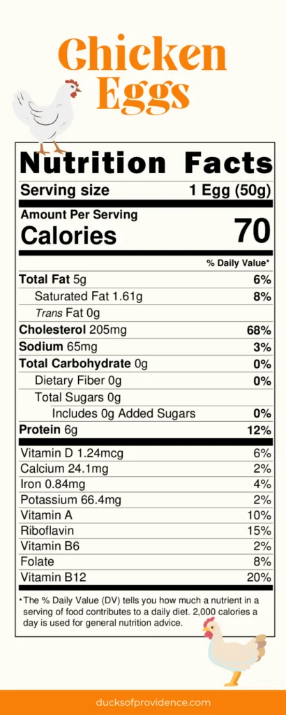 Here’s a simplified comparison of the nutritional content of duck eggs and chicken eggs per 100 grams (From the USDA):