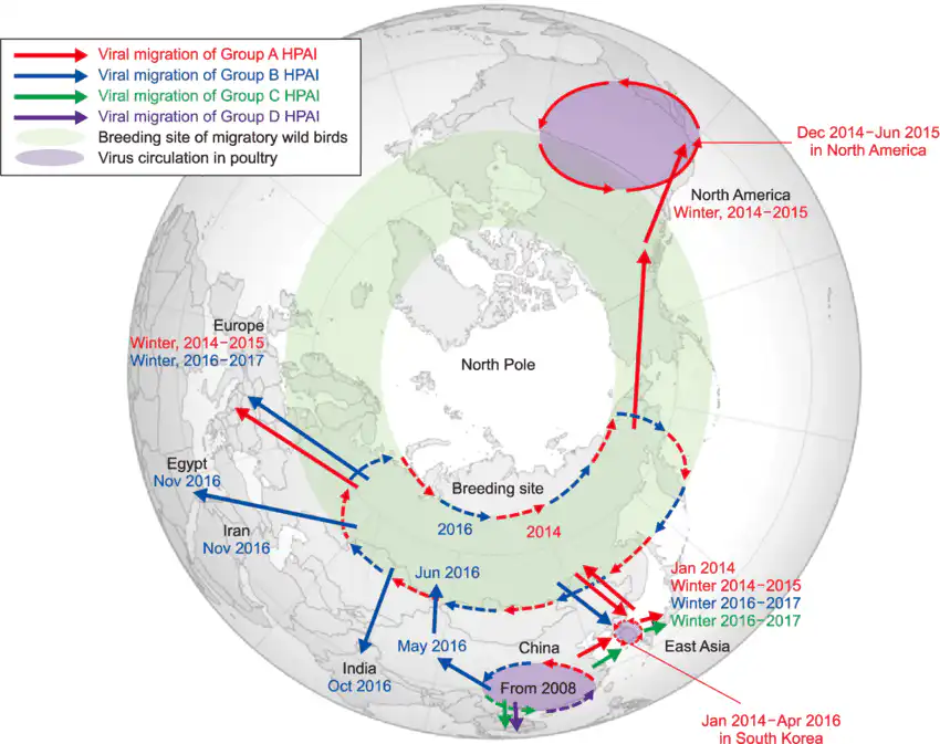 Many species of wild ducks and geese, especially mallards, are natural carriers of avian influenza viruses, including H5N1. These birds can shed the virus through saliva, nasal secretions, and droppings without showing any signs of illness. That means they can be infected, fly hundreds of miles, land in a pond behind your home, and unknowingly leave the virus behind.
