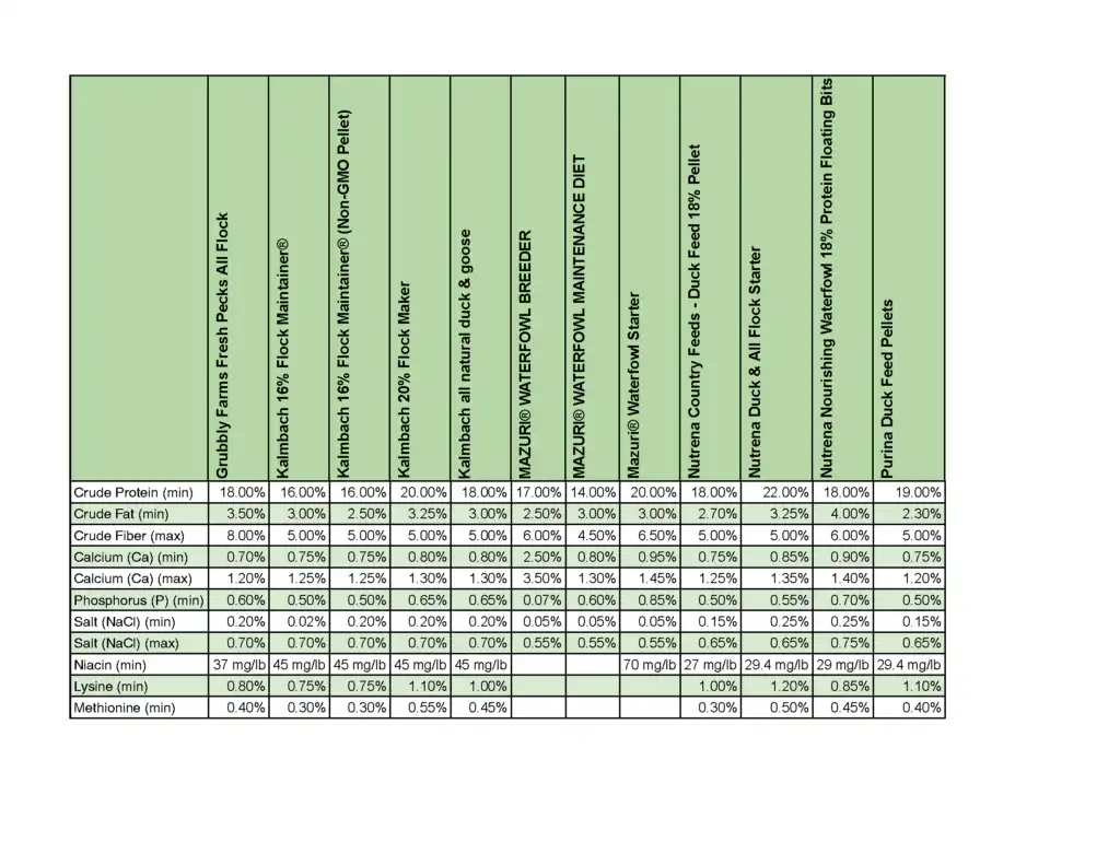• Highest: Nutrena Nourishing Waterfowl 18% Protein Floating Bits and Mazuri® Waterfowl Starter (0.70% and 0.85% respectively)