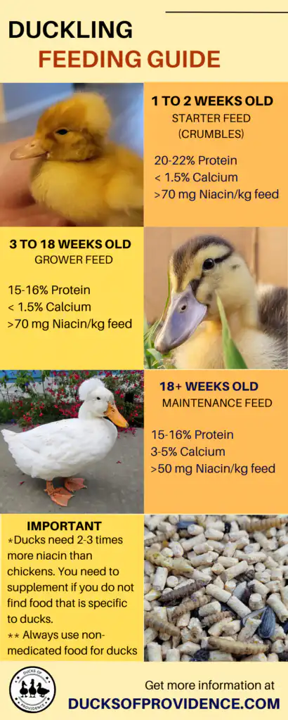 Ducklings require more niacin than chicks to develop strong legs. If feeding chick starter, supplement with niacin to prevent leg deformities.
