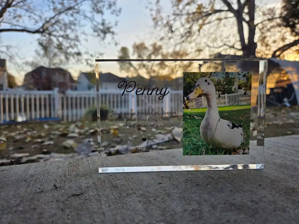 Inside the house, Penny’s ashes and her acrylic memory plaque sit next to Hertha’s. The plaque reads, “Your wings carried you farther than your tired body could. Fly free, sweet girl.” Together, these memorials keep Penny close. Outside, she rests among the flock she loved. Inside, she remains part of our daily life, just as she always was.