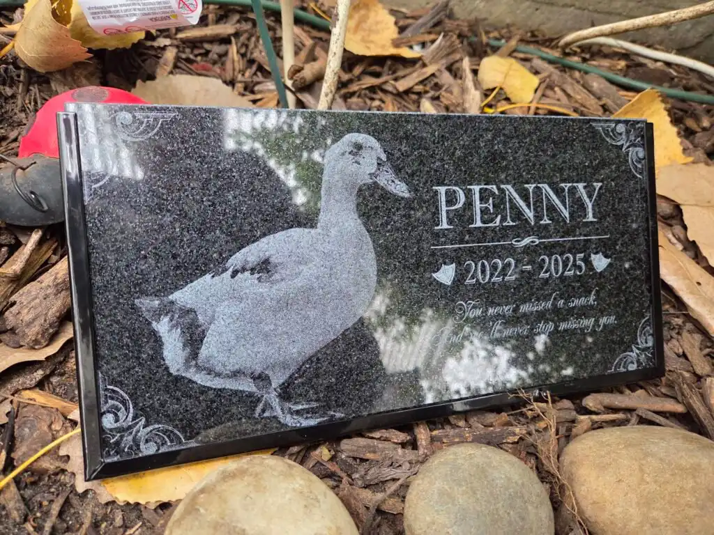 Penny’s memorial stone now rests in the yard beside Hertha’s. Seeing their stones together feels right. They were part of the same story, connected through the flock and through Simon, and now they share that space once more. Penny’s stone reads, “You never missed a snack, and we will never stop missing you,” a line that captures her spirit perfectly.
