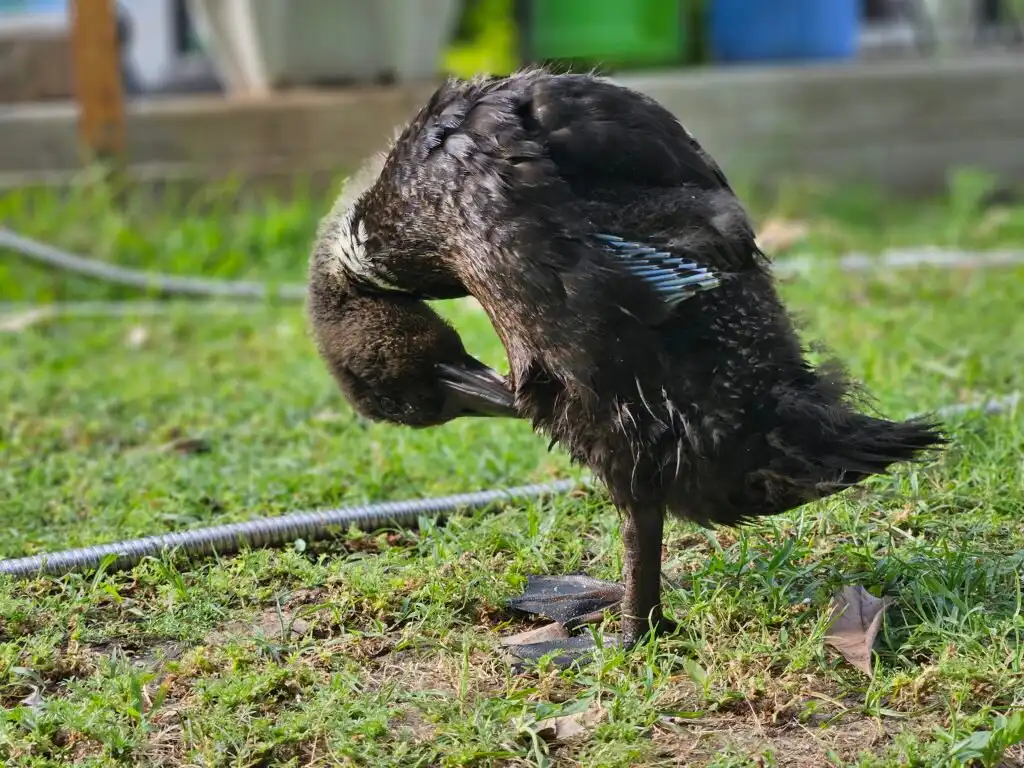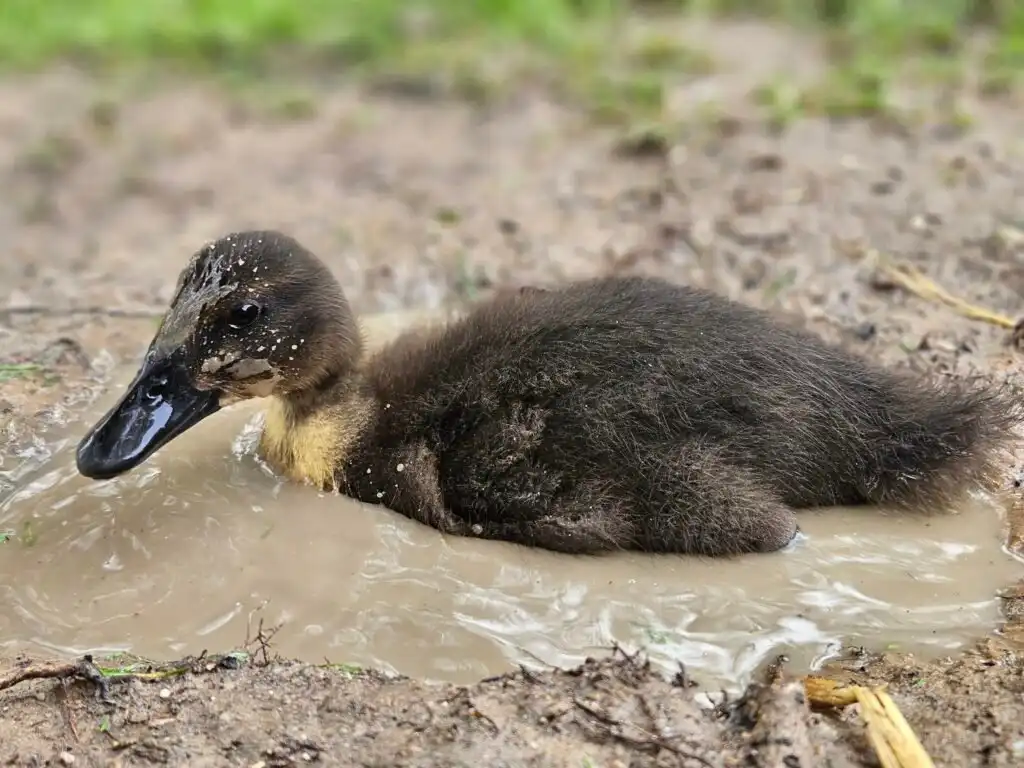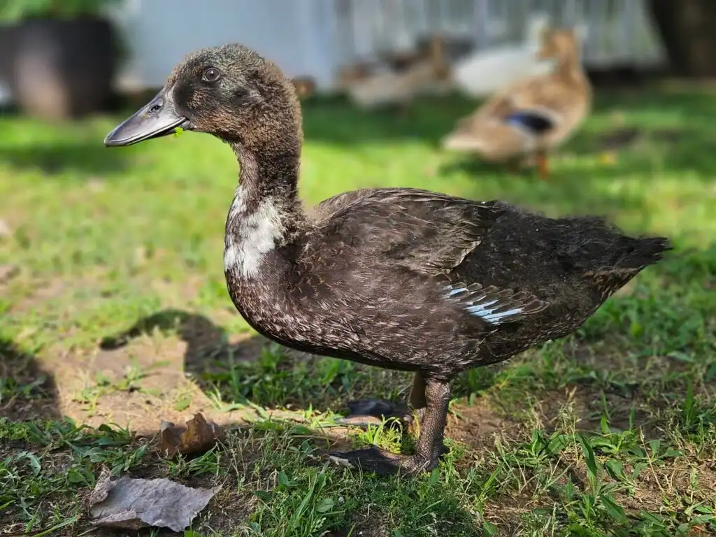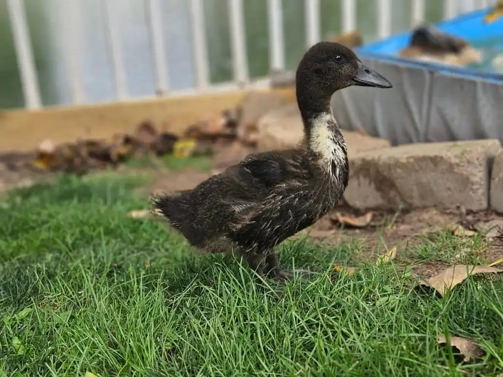 We’re not entirely sure what I am, but Mom thinks I’m a hybrid between a Cayuga and a Mallard. I’m super tiny, just a little bigger than a Mallard, with dark feathers and a white bib. In the sunlight, you can see hints of brown mixed into my plumage, giving me a classic mottled Mallard look. I also have beautiful, big wings, and I’ve just figured out how to use them!
