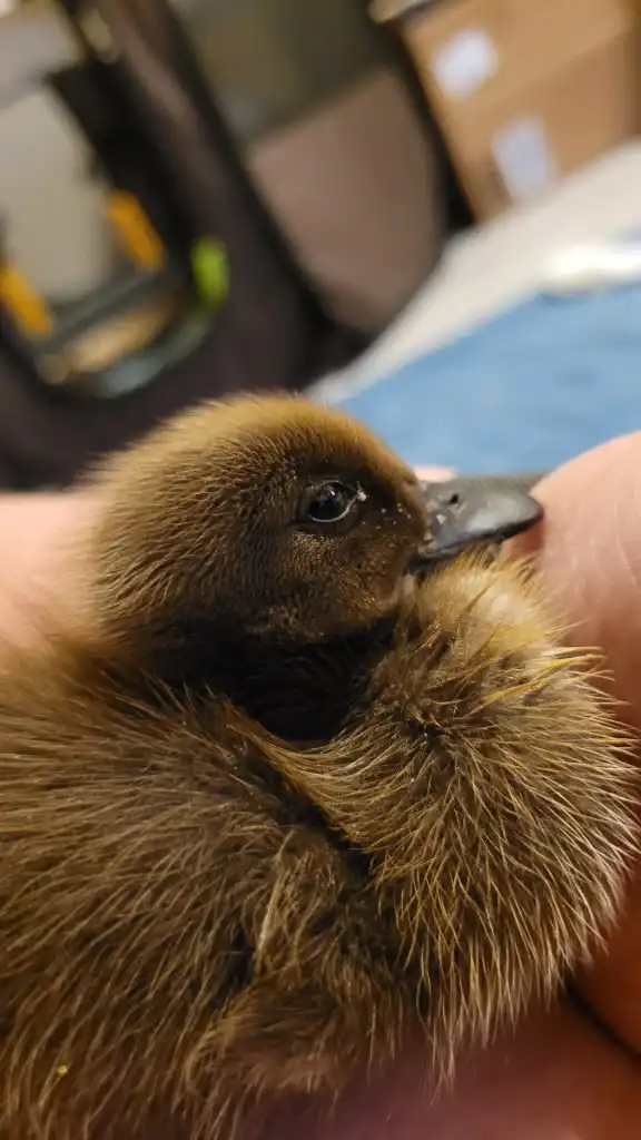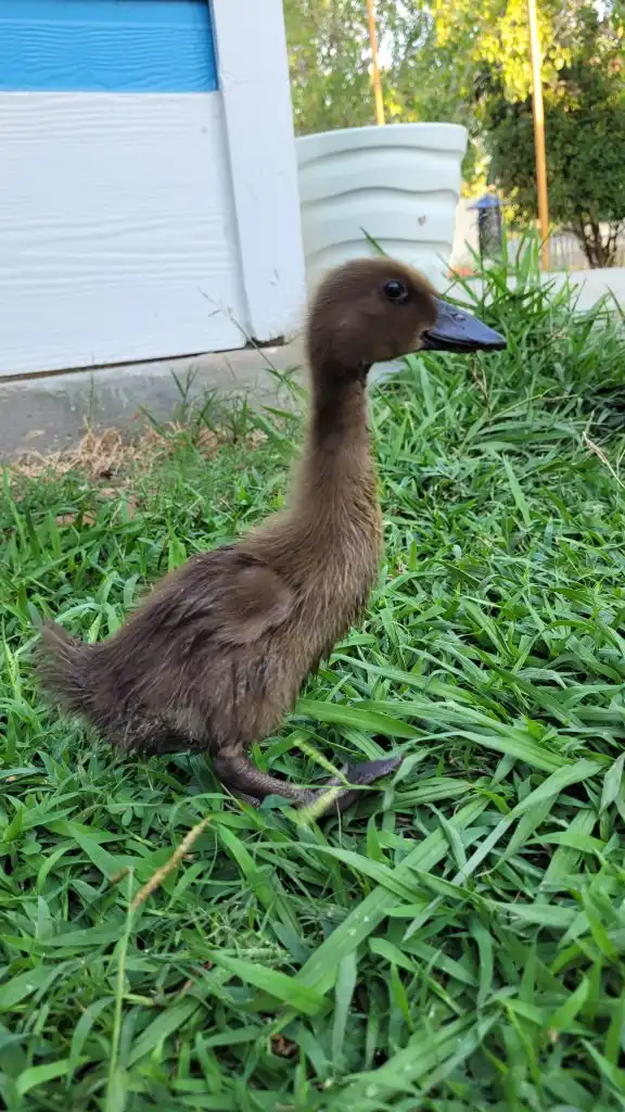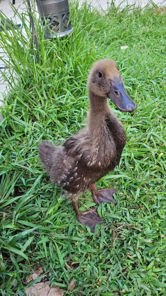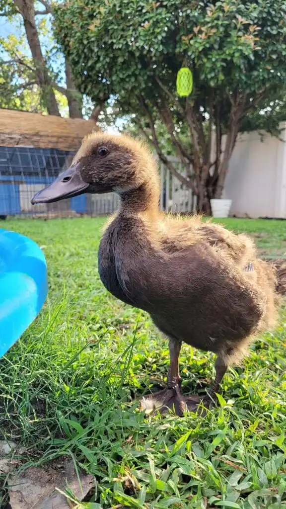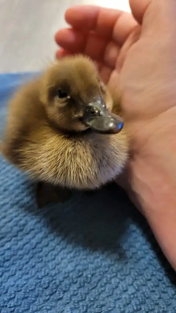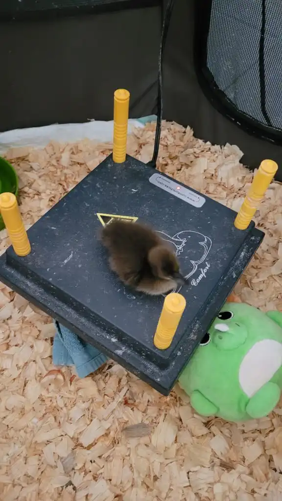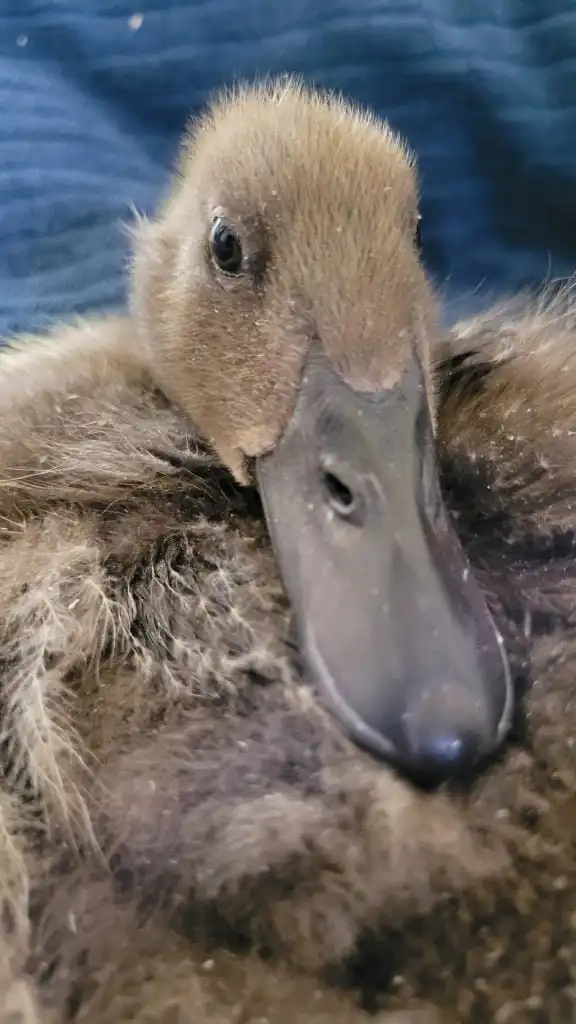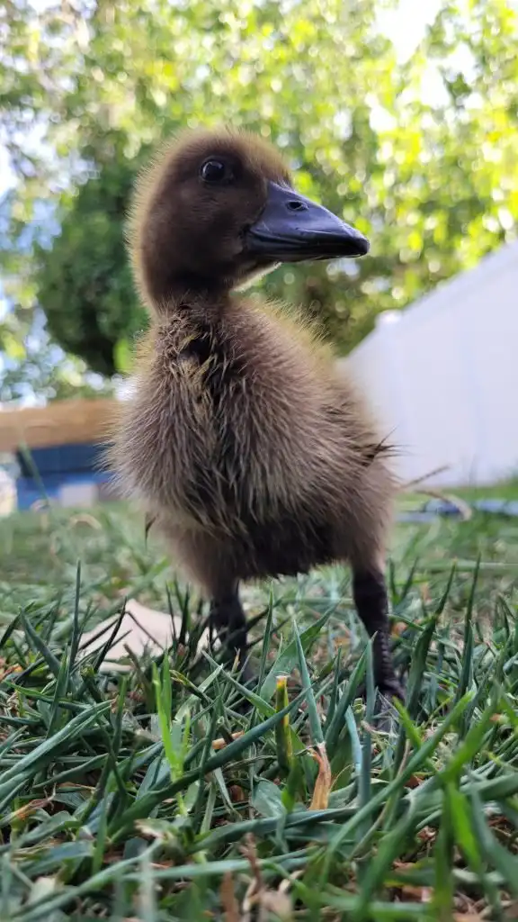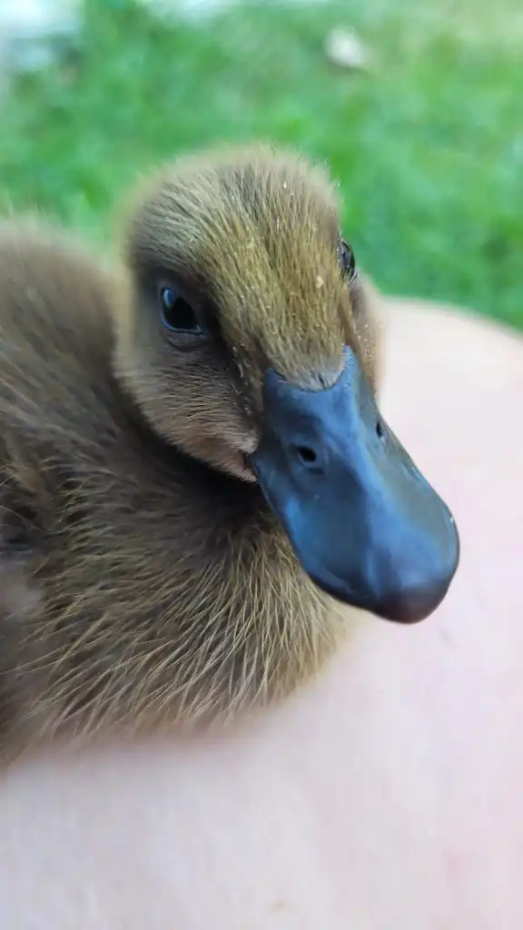 That is an interesting story. On August 5th, 2022, I showed up at the fence of my new home. I was a tiny duckling, about two days old and lost. I was following the noises of the other ducks and ended up at the fence right next to their coop. I was very lucky that Dad heard me peeping and wandering through the dry leaves that afternoon. He immediately told Mom: Hey, there is a duckling! She wouldn’t believe him at first because it was so unlikely. But it was true. Soon, she came out to pick me up. They were looking for my mom or siblings, but no one was in sight. So they took me in and set up a brooder for me in no time. Since I was still soooo young, I still needed a heating plate. Luckily, they also still had duckling food.