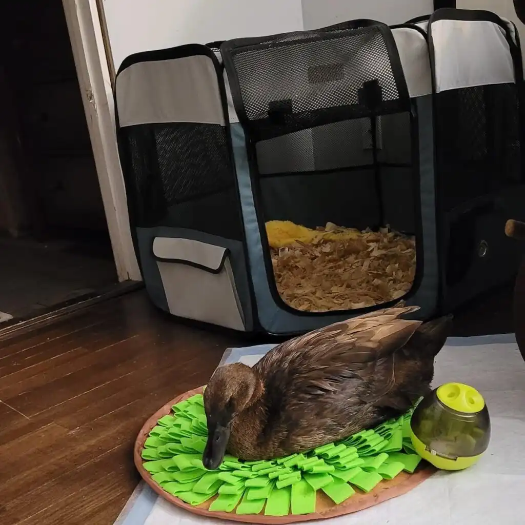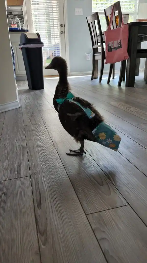 I am a very spoiled part-time house duck. I am also very sassy and up for shenanigans. Since I grew up inside the house, and so imprinted on my humans, I still prefer to stay inside the house every night. As soon as the sun goes down, I demand to come in. I have my playpen, which is my nest for the night. But I am allowed to wander through the house when I am wearing my diapers. I am very adventurous and love to discover new things. I am the ruler of the house, and my humans do everything I want for me 🙂