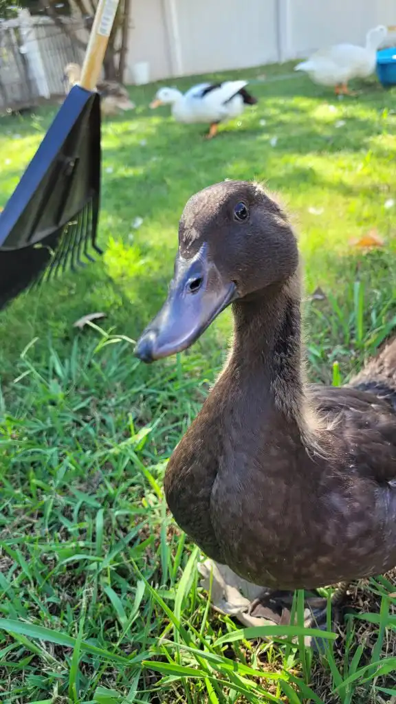 I am a Khaki Campbell duck, a smaller brown duck. Even my bill and feet are brown. I am supposed to be a good layer, with over 330 eggs a year. Let’s see. And because of my small size, I can fly.