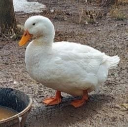 - Traits: White plumage, orange bills and legs, calm personality, heavy body.