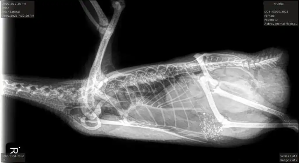 X-rays revealed a few soft-shelled eggs piling up inside her. Some of them had broken, leading to a serious infection. She began passing a foul-smelling mix of egg yolk and pus through her droppings. Our vet prescribed antibiotics again, and thankfully, Krümel has stabilized and is doing well for now.