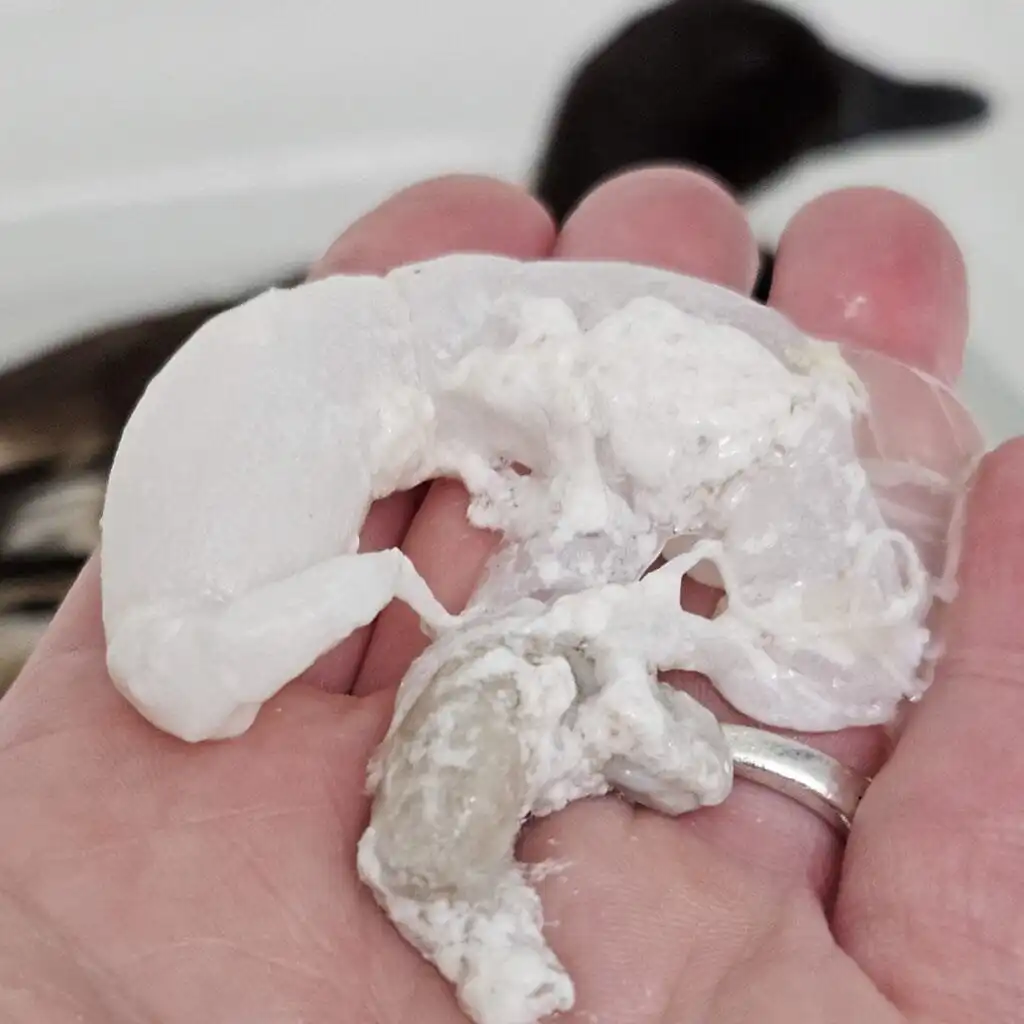 These fragile eggs lack the protective calcified shell normally applied in the shell gland (uterus). While sometimes caused by low calcium, they can also be due to shell gland dysfunction or hormonal issues—even when calcium levels are adequate. Soft eggs can rupture inside the oviduct or cloaca, leading to internal infection. In Krümel’s case, this happened silently, with eggs backing up and breaking inside her, triggering a serious bacterial infection. If you see membrane-like material in the nest or vent area, or your duck is straining without success, it may be due to a soft-shelled egg.