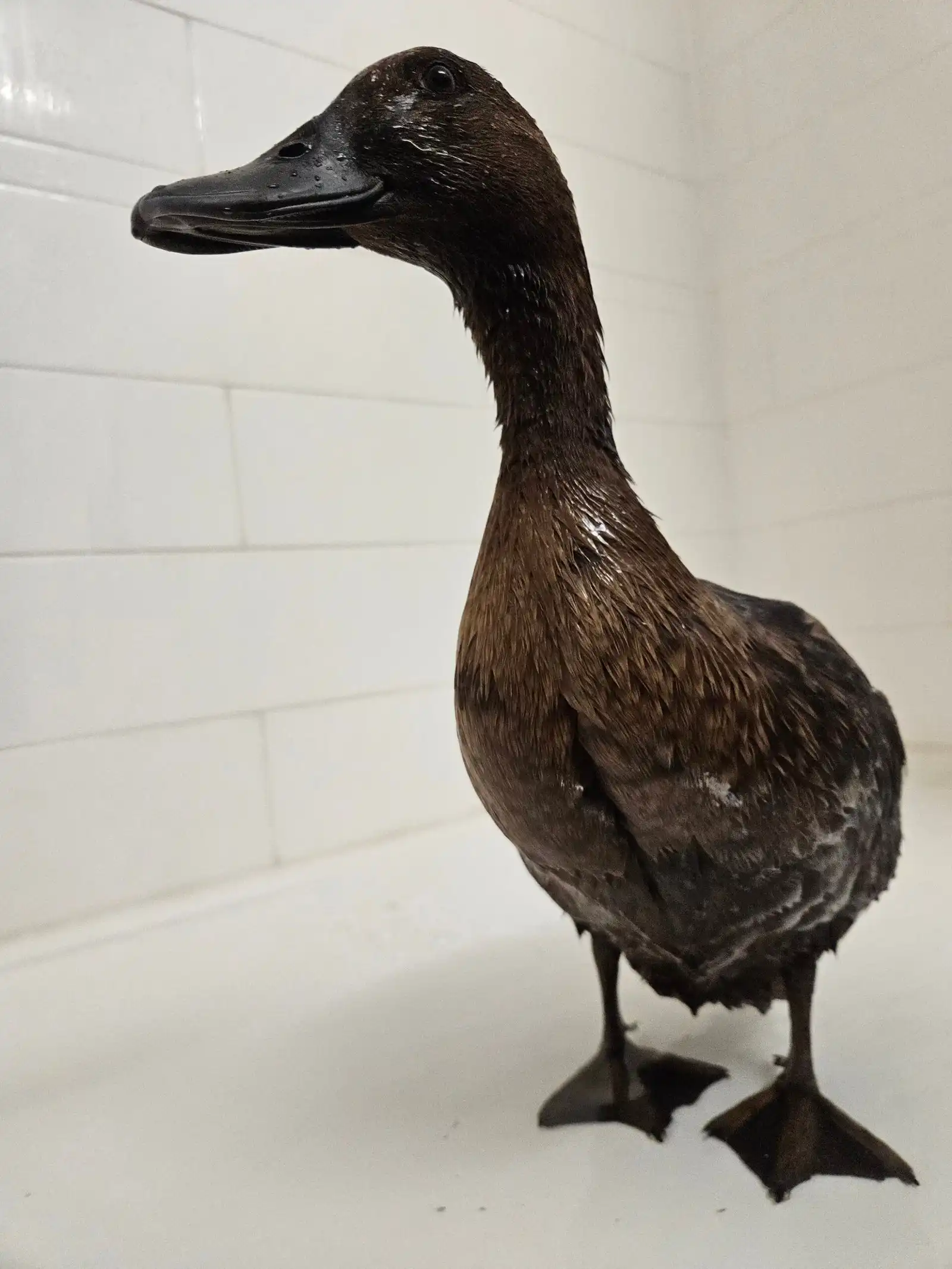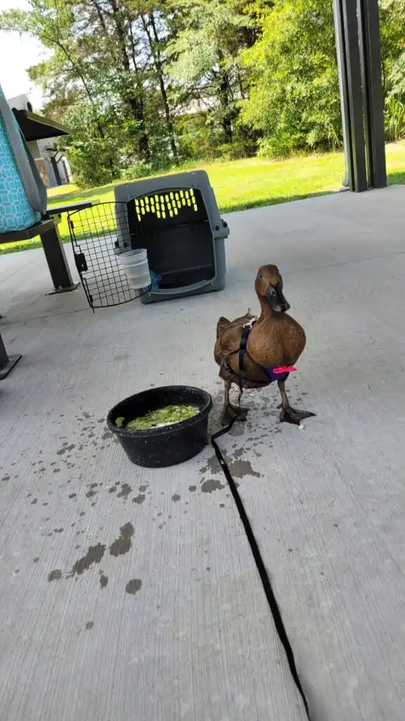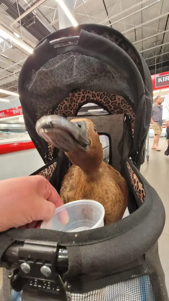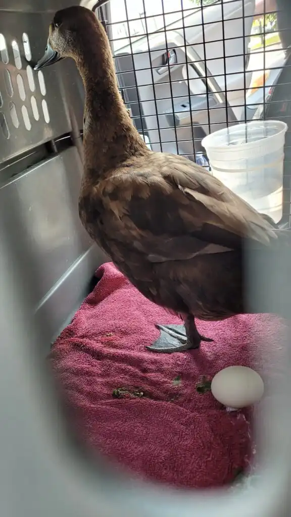 She always had fresh water in a spill-proof bowl inside the crate. We also made sure to talk to her often, keeping her engaged and calm. Ducks are incredibly social animals, and hearing our voices seemed to reassure her that everything was okay.