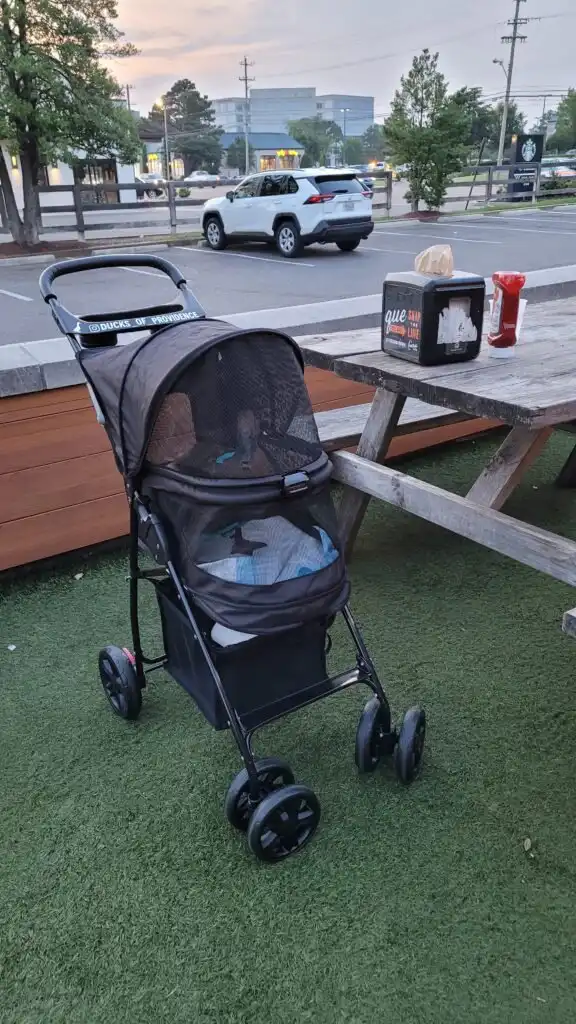 In Ann Arbor, we stayed at a friend’s house and used the same setup as our hotels: a soft playpen, all her travel gear, and her usual comforts. We took her sightseeing through the city, and she joined us for outdoor strolls, relaxing in her stroller and watching the world go by. Ann Arbor’s walkable downtown made it perfect for a duck-friendly outing.