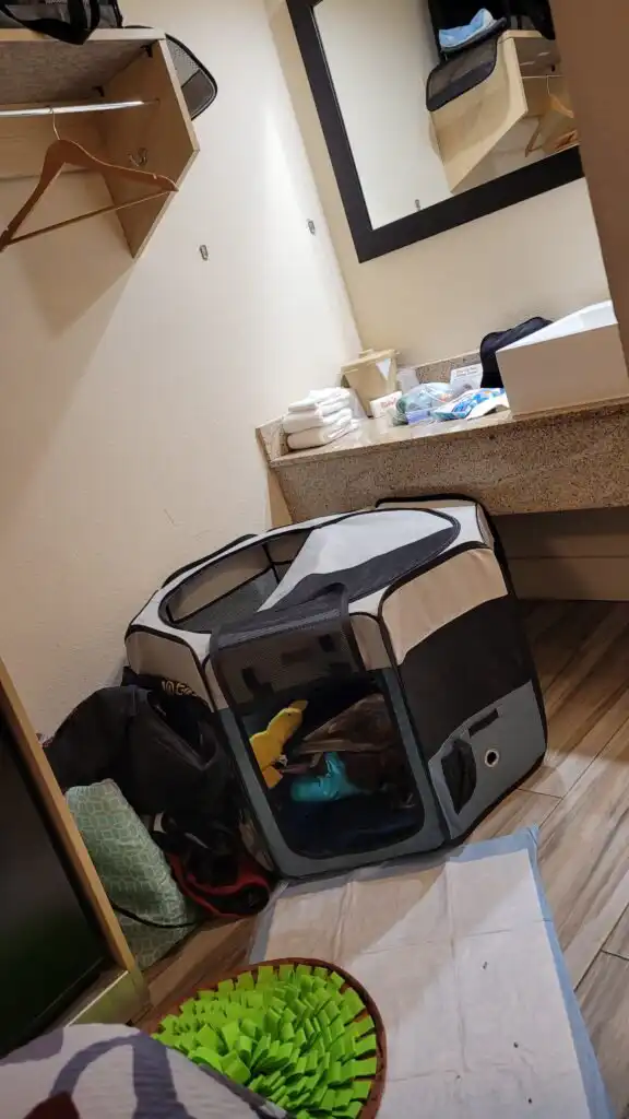 - A foldable soft-sided playpen, which served as her secure area during the night and whenever we left the room briefly without her