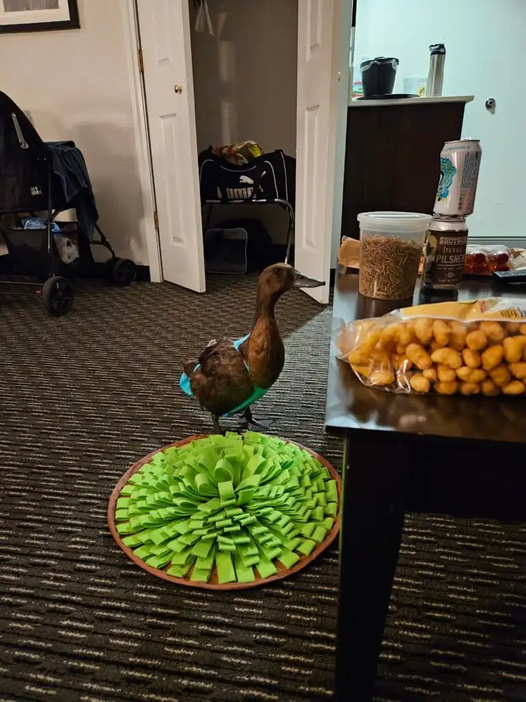 New environments can be overwhelming for ducks, so we tried to keep her routine as consistent as possible. That meant offering her food and water at the usual times, giving her quiet time to nap, and letting her snuggle in her favorite soft spot when she needed rest.